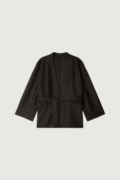 GIBSON is a green ebony boiled wool trouser with a loose, rounded cut. Italian and welt pockets, plus knee darts, highlight its style. Dense, supple wool ensures an elegant silhouette.