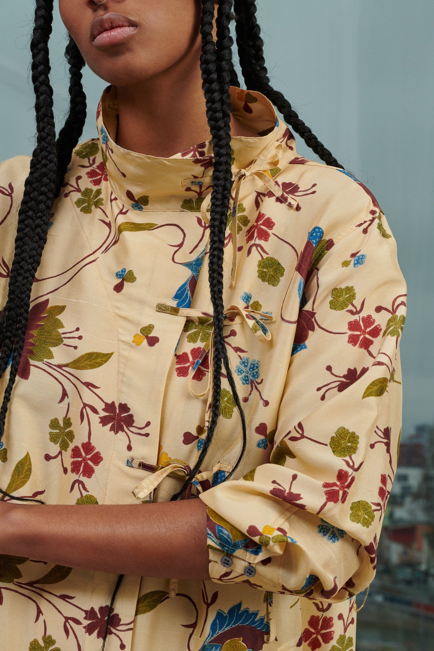 - Long, curved sleeves with buttoned cuffs